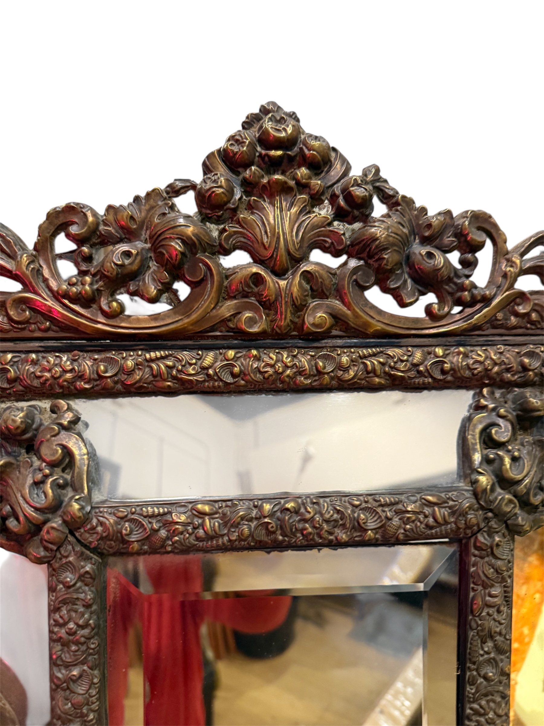 Espejo francés antiguo biselado de latón patinado