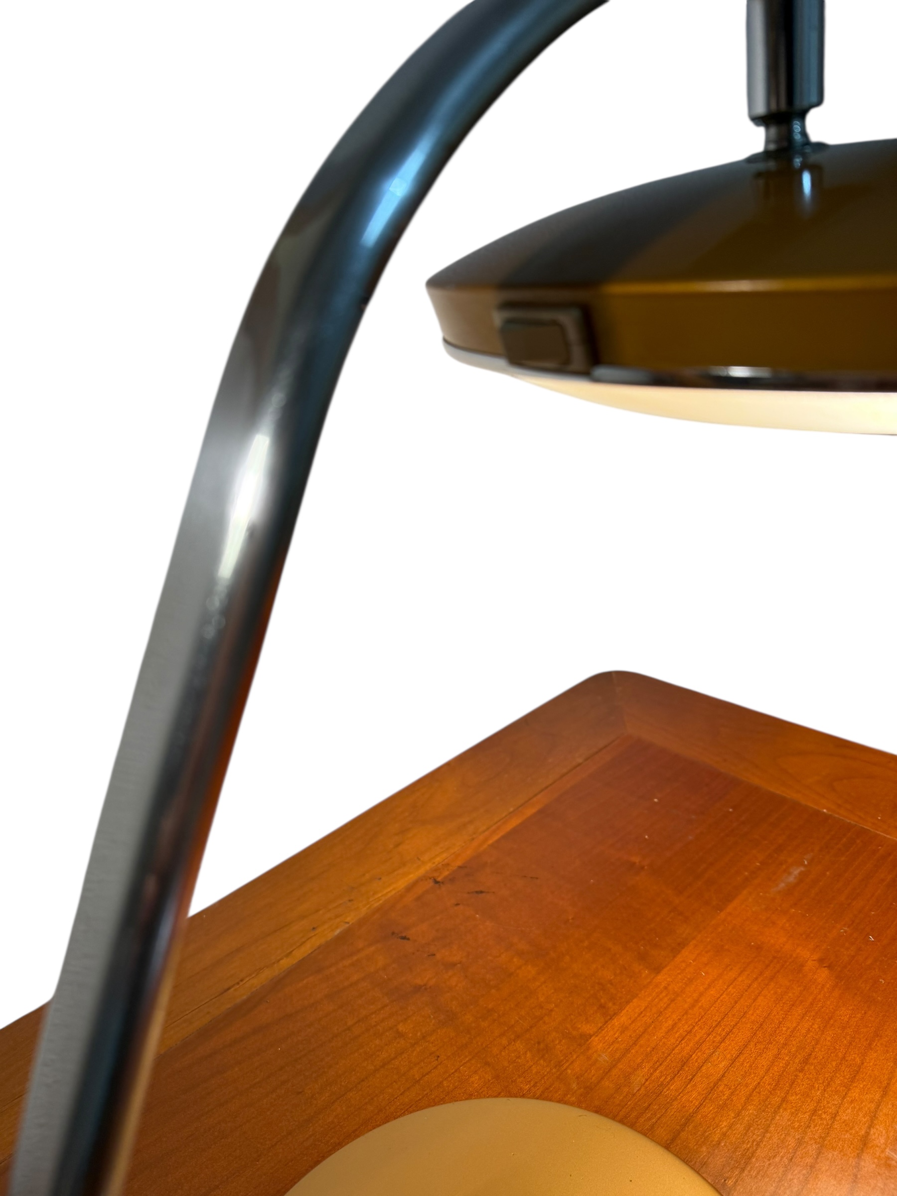 Su elegante brazo curvo de acero cromado genera una silueta dinámica que contrasta con la solidez de la base en metal lacado en tono bronce. La pantalla orientable, concebida para albergar dos puntos de luz y difusor, ofrece una iluminación eficiente y modulable, subrayando su vocación tanto estética como funcional.